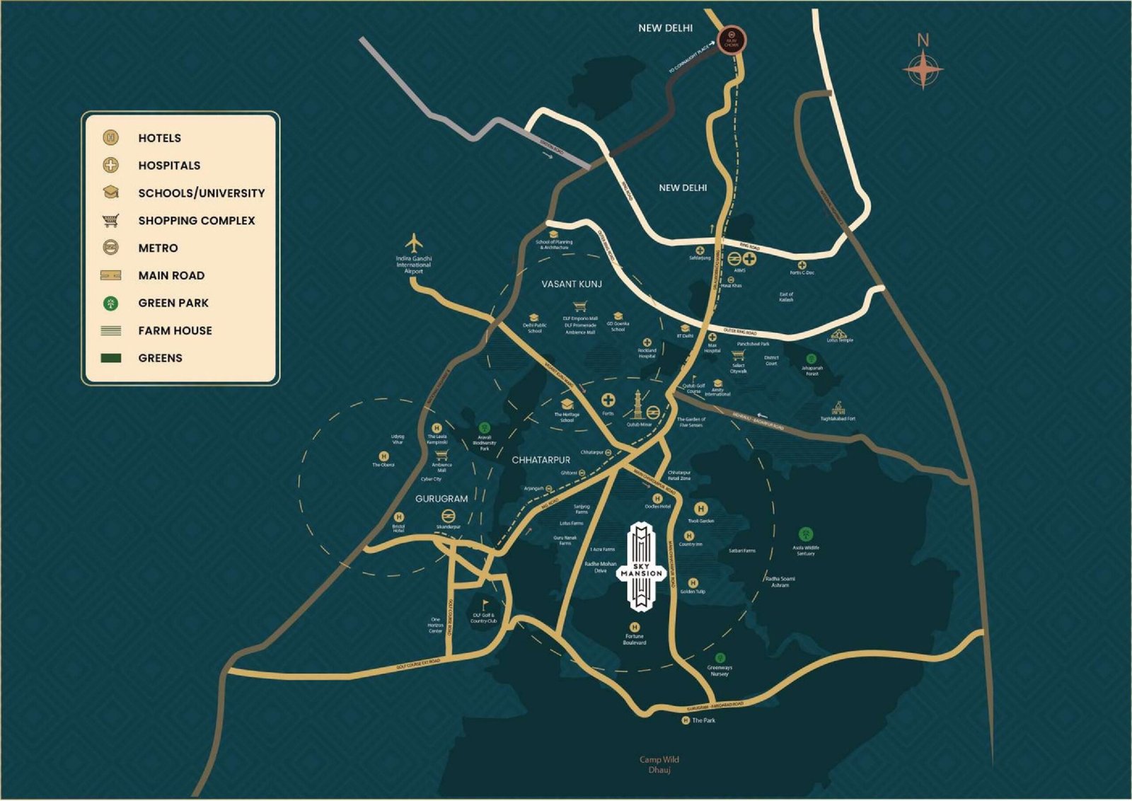 Strategically positioned in the heart of South Delhi’s elite farmhouse district, Sky Mansion offers unrivaled access to the capital’s most prestigious hubs. Enjoy seamless connectivity to the IGI Airport, MG Road, and the thriving corporate centers of Gurgaon. With the city’s finest lifestyle destinations just minutes away, Sky Mansion places you exactly where you belong – at the pinnacle of luxury and convenience.
